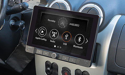 Med X-127 kan du bruke smarttelefonen i kjøretøyet spesielt enkelt og trygt. Mobiltelefonen din kan dokkes direkte til infotaineren via USB - X-127 støtter da Apple CarPlay og Google Android Auto. Gjør samtaler, bruk navigasjonskart, lytt til og dikter meldinger, spille musikk og podcaster – du kan kontrollere appene som kalles opp enkelt via berøringsskjermen, Apple Siri eller Googles Assistant.